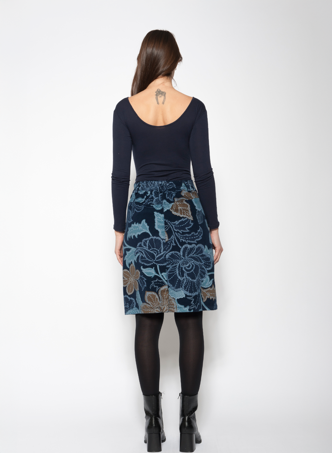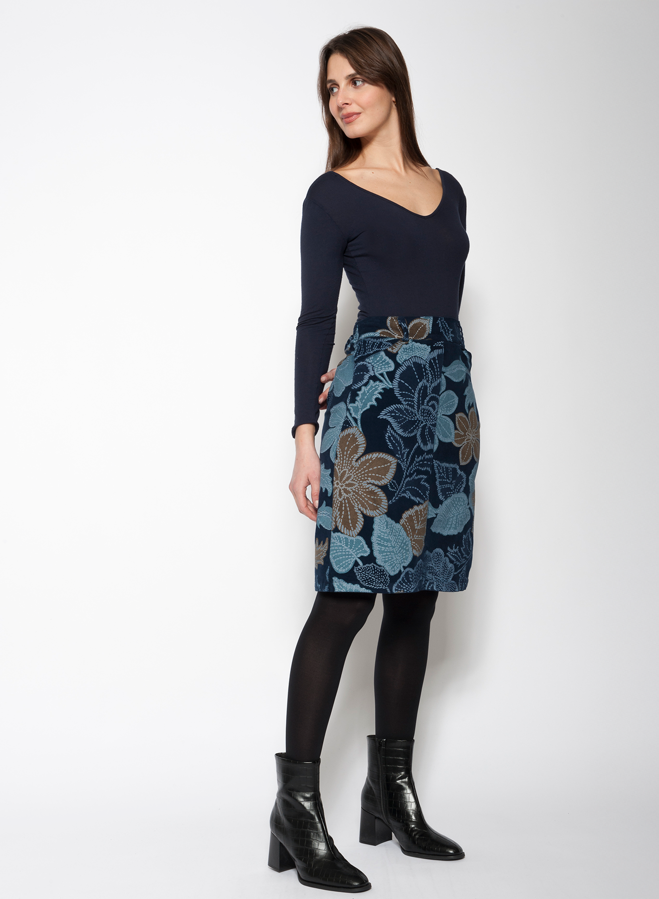 Der BLUEBERRY Rock vereint Komfort und Stil mit einem dekorativen Print, der sofort ins Auge fällt. Hergestellt aus 100 % Naturfasern, überzeugt er durch hohe Atmungsaktivität und ein angenehmes Tragegefühl. Der knielange Schnitt macht ihn vielseitig kombinierbar – ideal für lässige Looks oder besondere Anlässe. Setzen Sie auf nachhaltige Eleganz mit diesem einzigartigen Lieblingsstück.